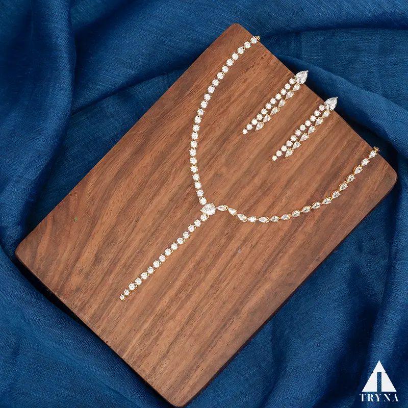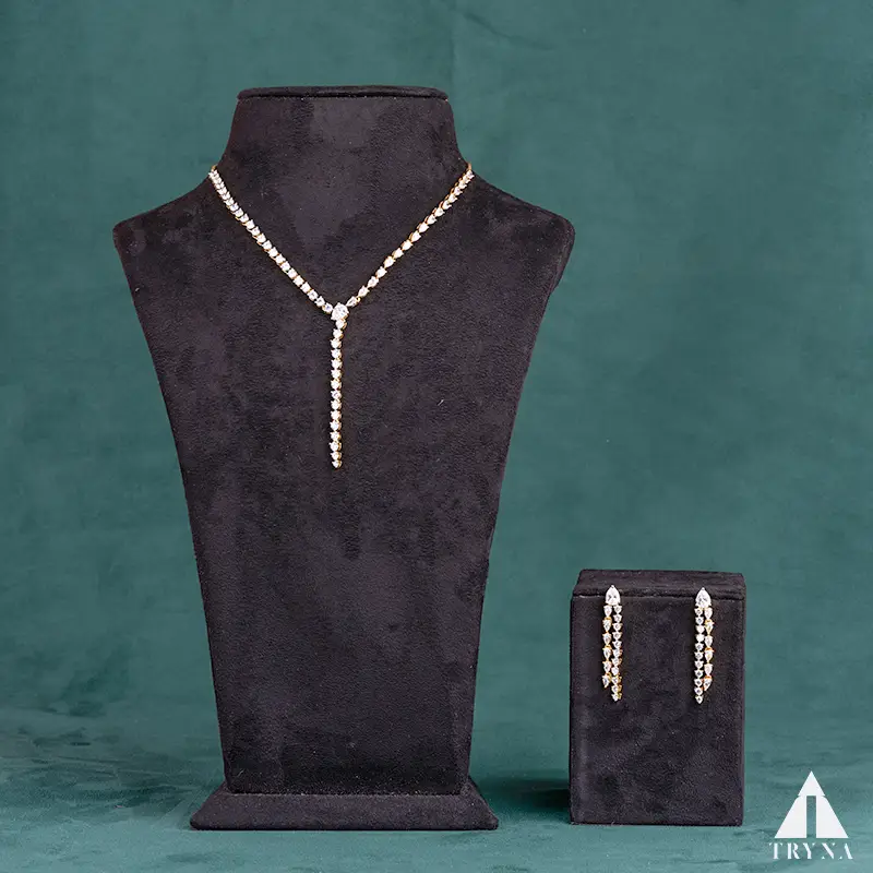 This exquisite necklace and earring set features vibrant emerald green drops paired with dazzling CZ diamonds. The design blends a royal charm with contemporary elegance, giving a graceful and sophisticated look. The dangling pearl-style drops add movement and refinement, making it perfect for statement styling.