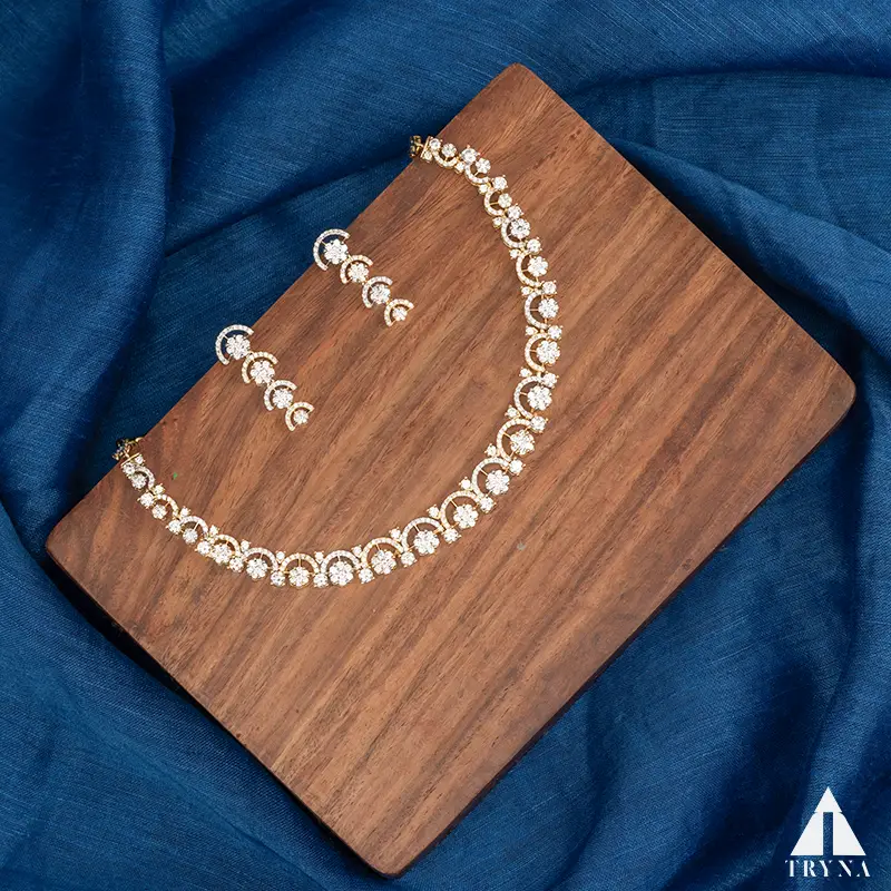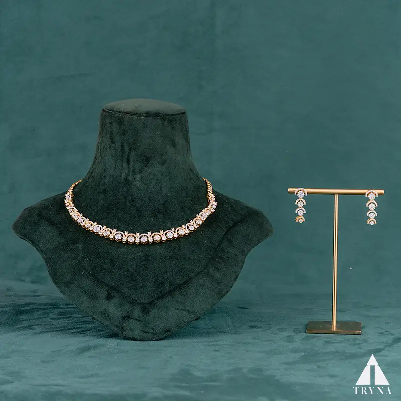 This exquisite necklace and earring set features vibrant emerald green drops paired with dazzling CZ diamonds. The design blends a royal charm with contemporary elegance, giving a graceful and sophisticated look. The dangling pearl-style drops add movement and refinement, making it perfect for statement styling.