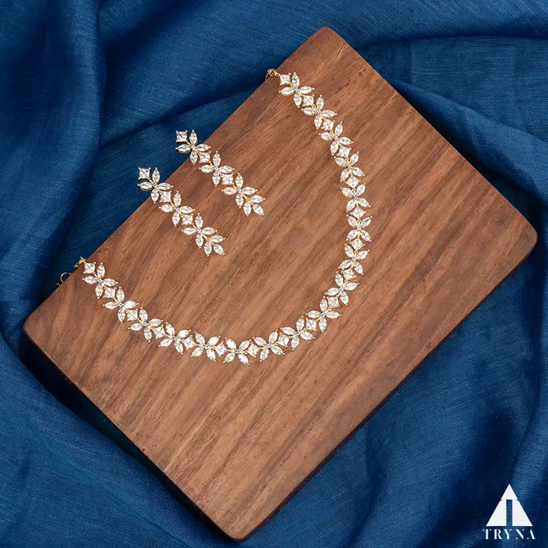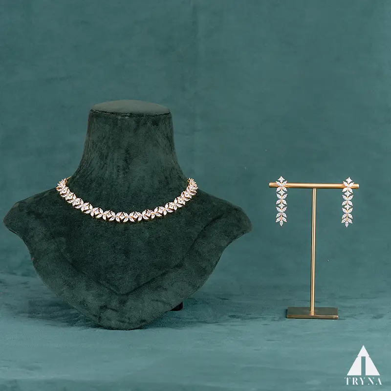 This exquisite necklace and earring set features vibrant emerald green drops paired with dazzling CZ diamonds. The design blends a royal charm with contemporary elegance, giving a graceful and sophisticated look. The dangling pearl-style drops add movement and refinement, making it perfect for statement styling.
