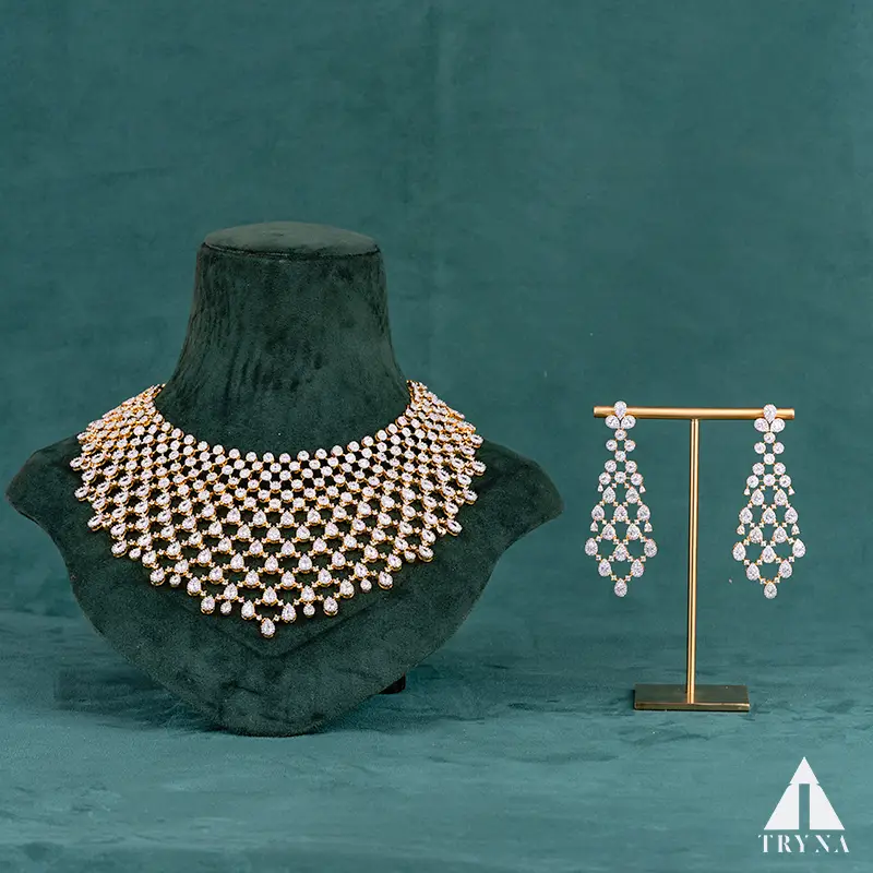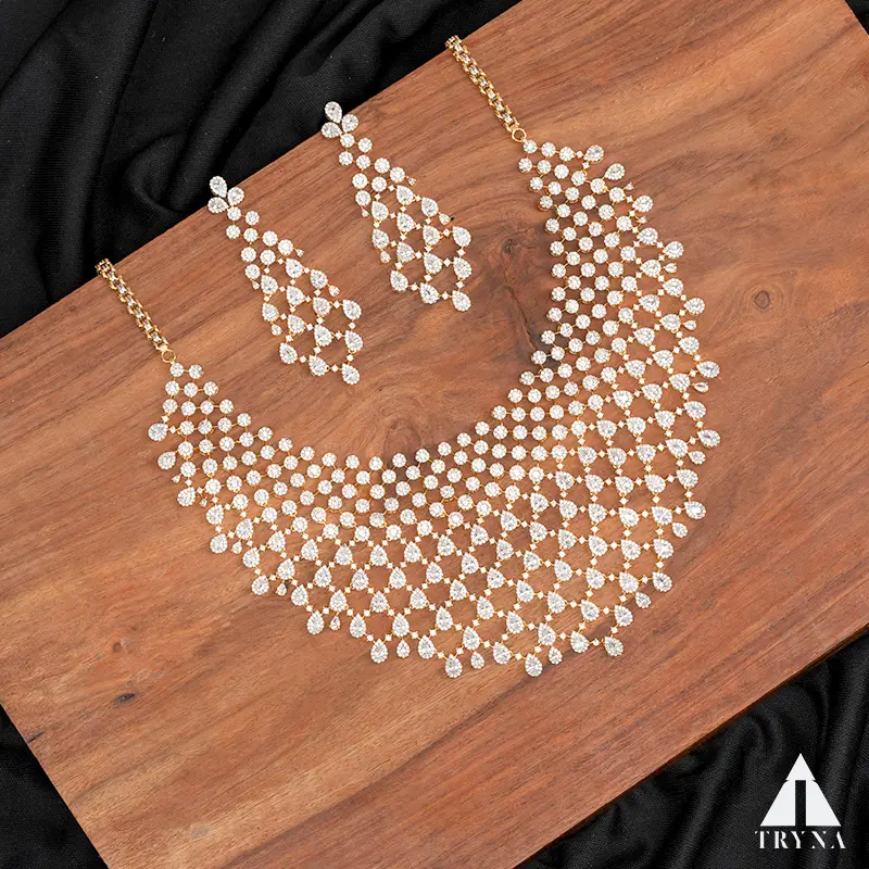 A fluid lattice of sparkling round CZs forms a draped net that hugs the neckline and ends in subtle teardrop accents. Matching elongated chandelier earrings mirror the mesh pattern for a glamorous, camera-ready glow.