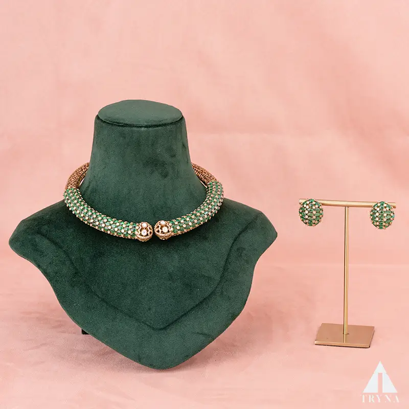 This exquisite necklace and earring set features vibrant emerald green drops paired with dazzling CZ diamonds. The design blends a royal charm with contemporary elegance, giving a graceful and sophisticated look. The dangling pearl-style drops add movement and refinement, making it perfect for statement styling.