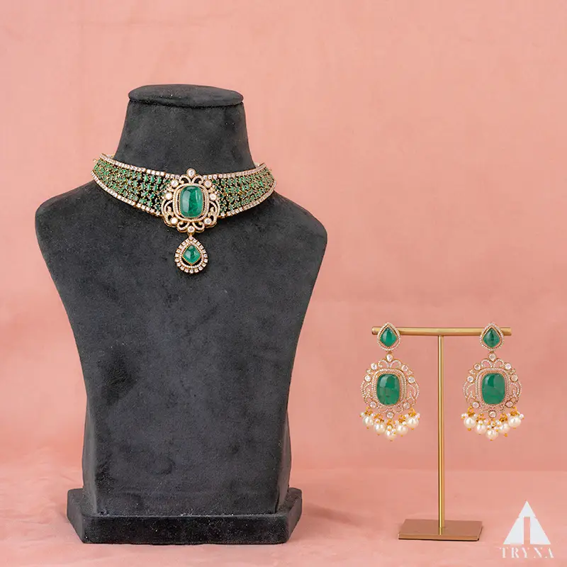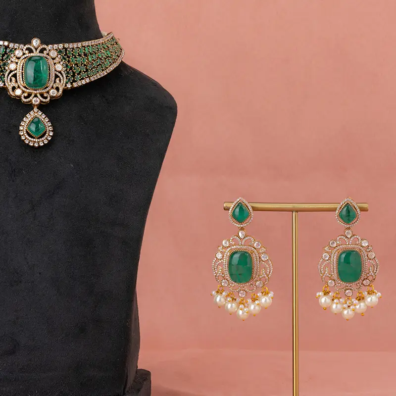 A richly beaded emerald choker frames an oval centerpiece with a delicate drop pendant. Matching chandelier earrings with pearl clusters mirror the motif, giving a regal, camera-ready glow that elevates lehengas and sarees.