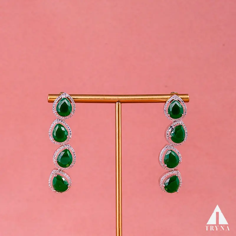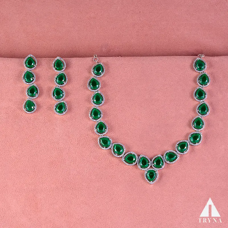 Smooth emerald-green cabochons set in sparkling CZ halos form a neat V-shaped collar. Clean, timeless, and bright—adds a fresh pop of green to sarees, gowns, or lehengas.