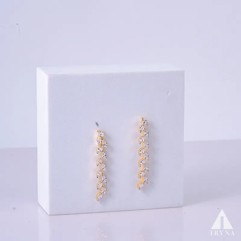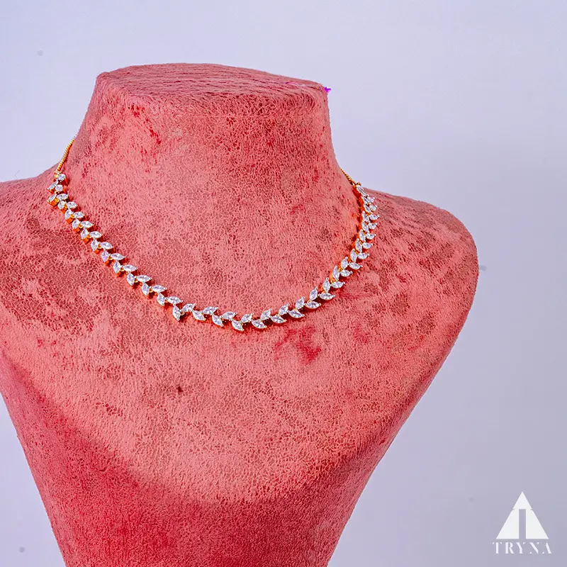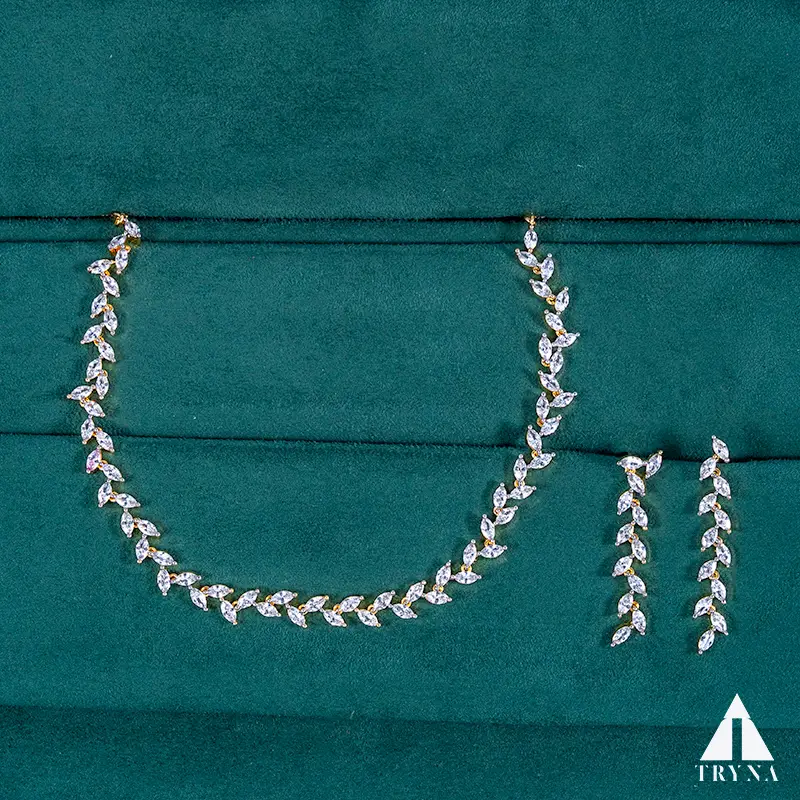 Marquise-cut CZ stones form a delicate leaf-vine that curves gracefully along the neckline. Matching linear vine earrings add airy sparkle—fresh, elegant, and camera-friendly.
