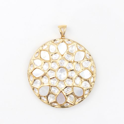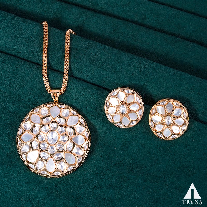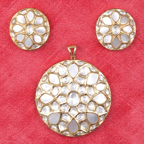 Feel and Look: This pendant set features a bold circular design encrusted with dazzling stones that form a floral mosaic. The matching earrings complete the radiant look, exuding a blend of sophistication and timeless beauty.