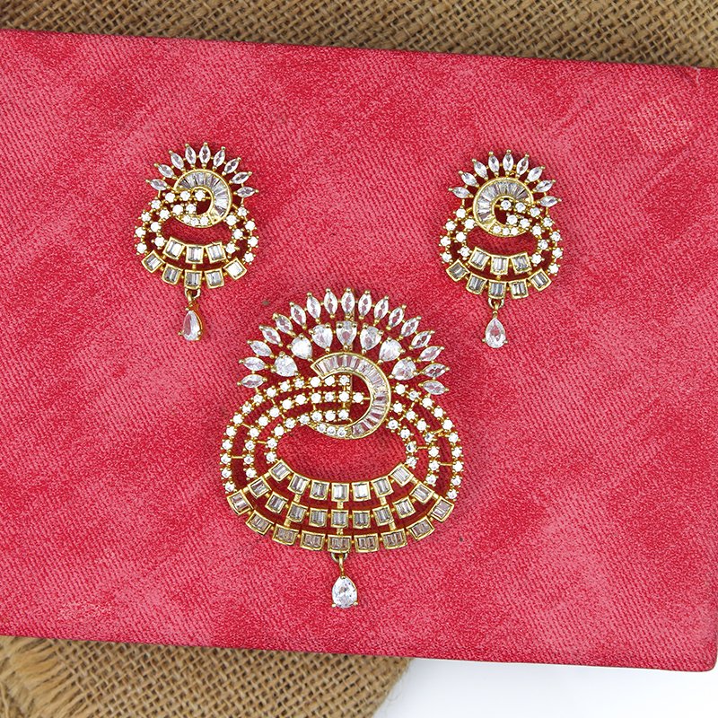 Luxury statement pendant featuring a crescent-fan silhouette with marquise and baguette CZ detailing, finished in rich gold tones. A bold blend of regal tradition and contemporary elegance.