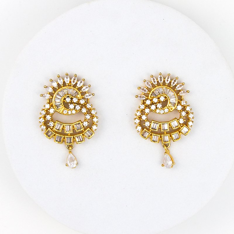 Majestic and radiant, this pendant showcases a sweeping crescent fan crowned with marquise-cut CZ stones that flare outward like a royal crest. The layered gold base set with precision-cut CZs adds depth and brilliance, while the single pear-drop accent brings graceful movement and refined sparkle.