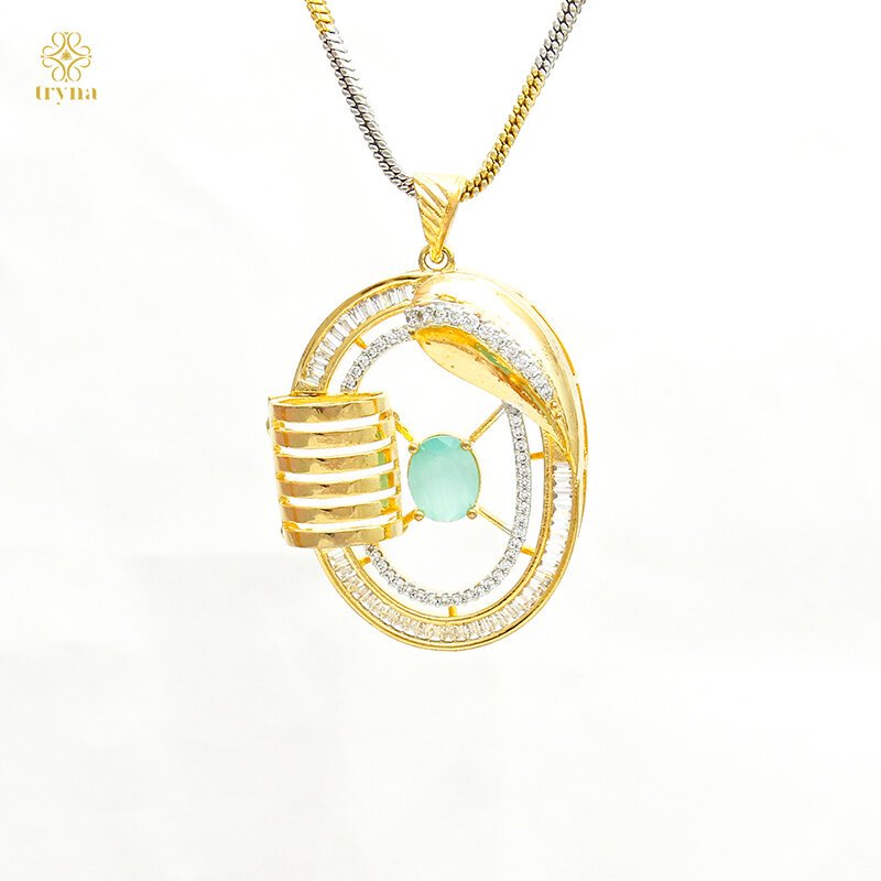 Designer pendant and earrings set with geometric circular frames, aqua stone accents, and CZ detailing, finished in radiant gold tones. A striking fusion of modern structure and elegant brilliance.