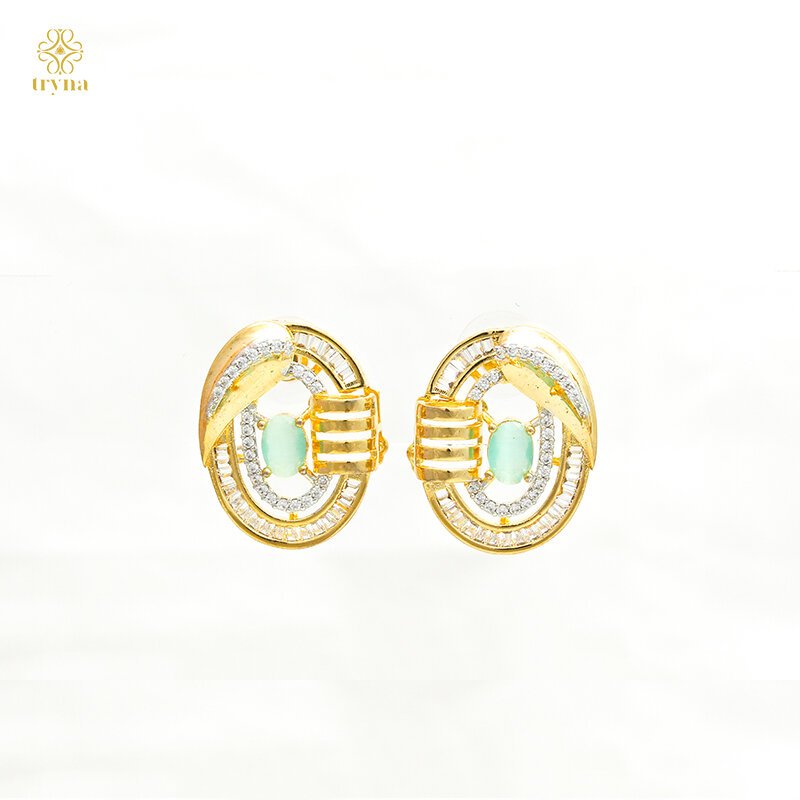 Modern and eye-catching, this jewellery set features layered circular frames accented with sparkling CZ stones and a soft aqua-blue centerpiece. The sculpted gold bars and flowing curves add depth and dimension, creating a contemporary design that feels both bold and refined.