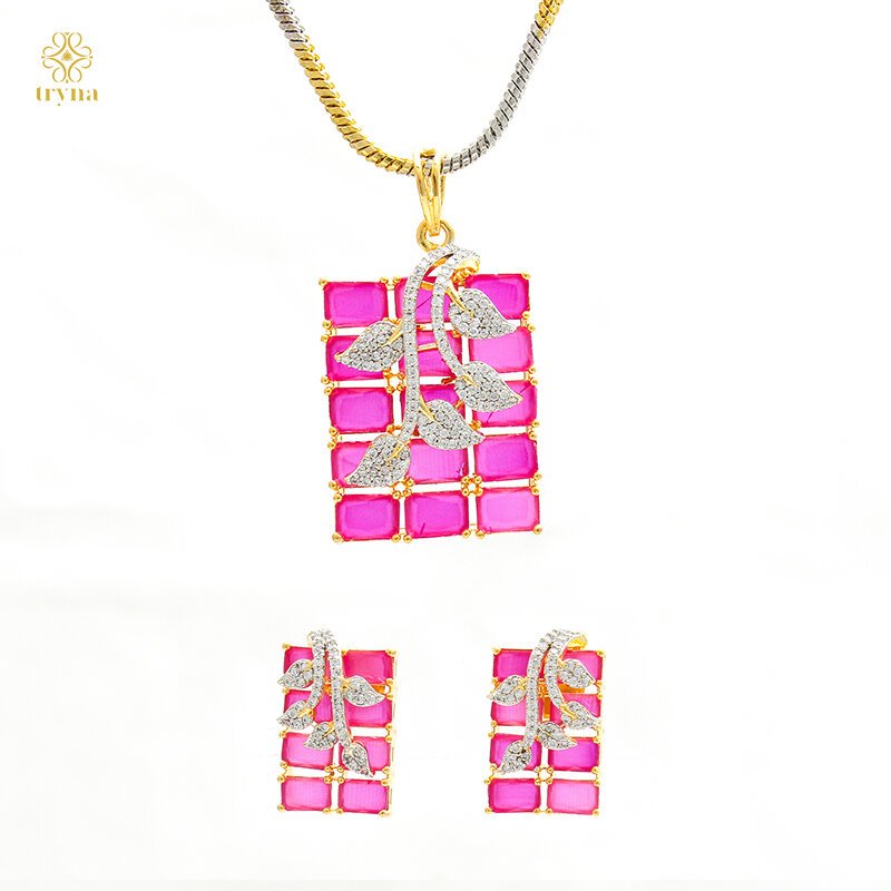 Designer pendant and earrings set with pink stone grid detailing and CZ leaf accents, finished in radiant gold tones. A contemporary fusion of nature-inspired artistry and modern elegance.
