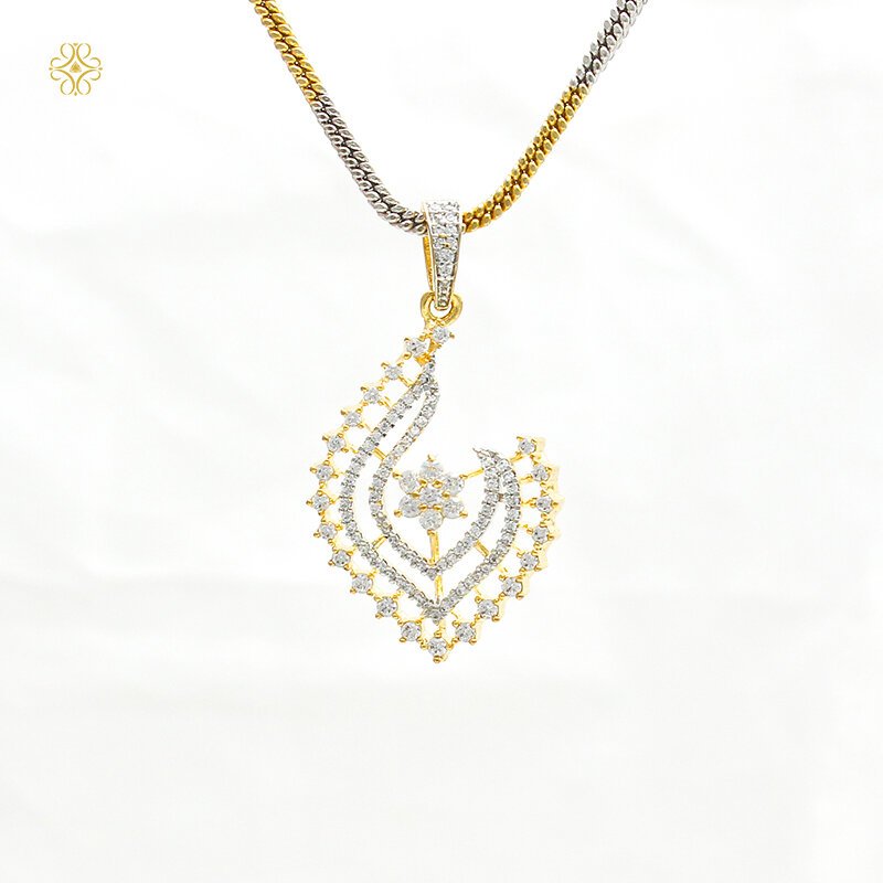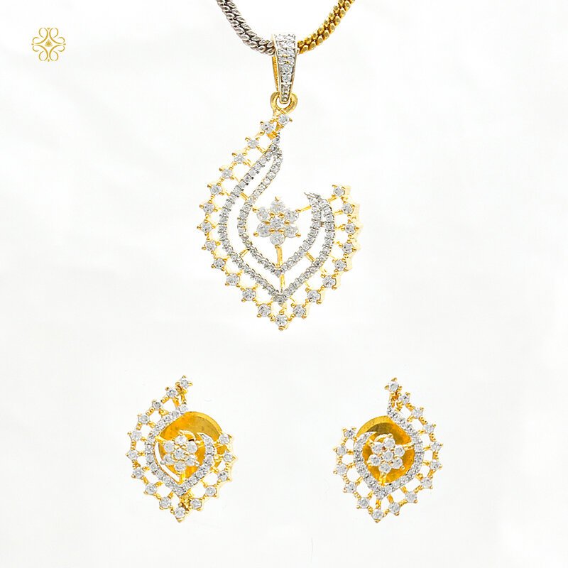 Delicate and radiant, this jewellery set features a flowing feather-inspired pendant crafted with shimmering CZ stones arranged in graceful layered curves. The central floral motif adds brilliance, while the matching earrings echo the same elegant sparkle for a balanced and refined look.