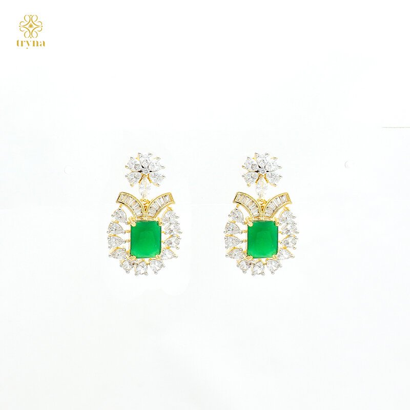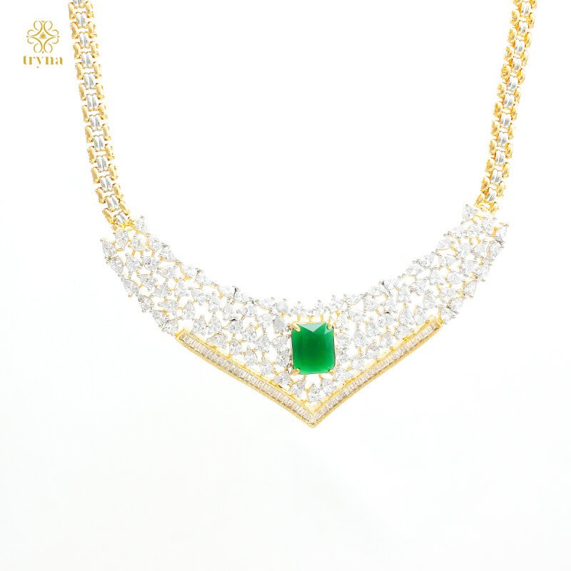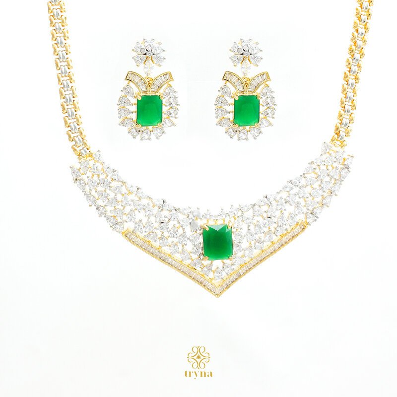Designer statement necklace and earrings set with a geometric CZ arrangement and a bold rectangular gemstone centerpiece, finished in radiant gold tones for a timeless and glamorous appeal.