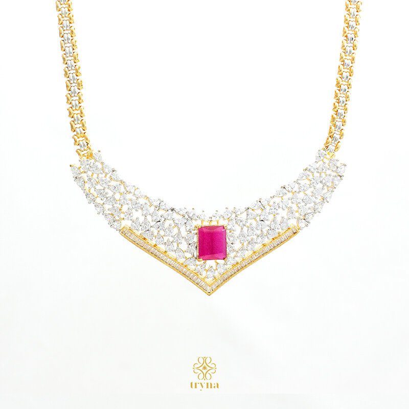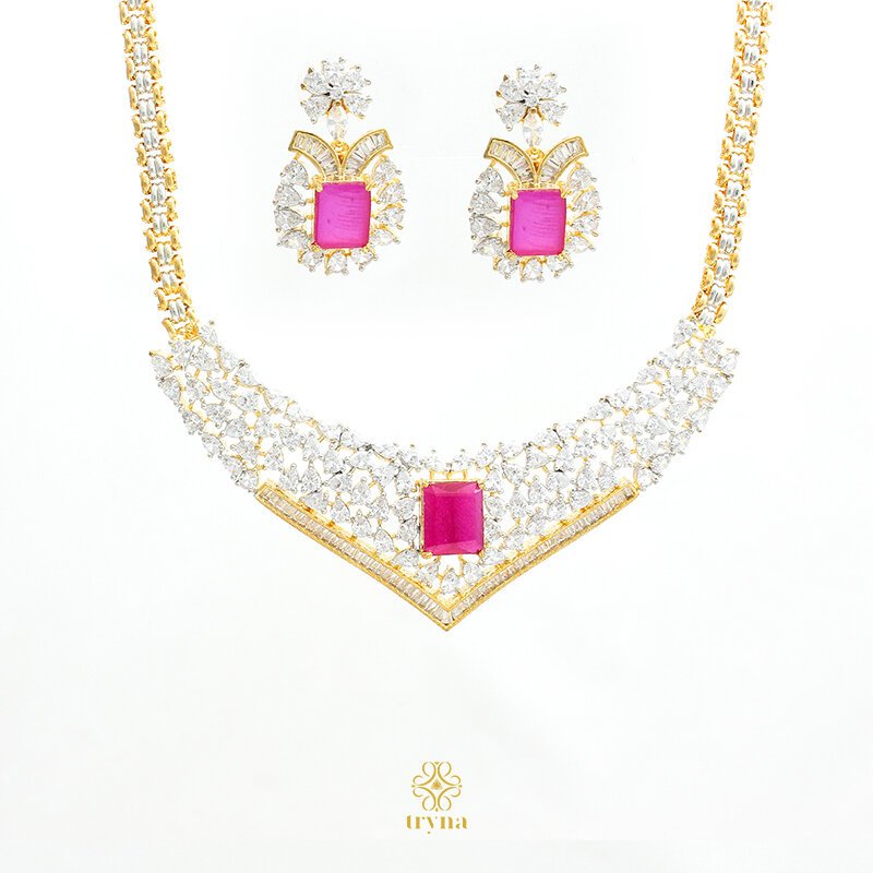Striking and sophisticated, this necklace set features a dazzling V-shaped arrangement of brilliant CZ stones centered around a vibrant ruby-toned gemstone. The layered sparkle creates a radiant frame for the bold centerpiece, while the matching earrings echo the same luxurious brilliance for a cohesive and regal look.