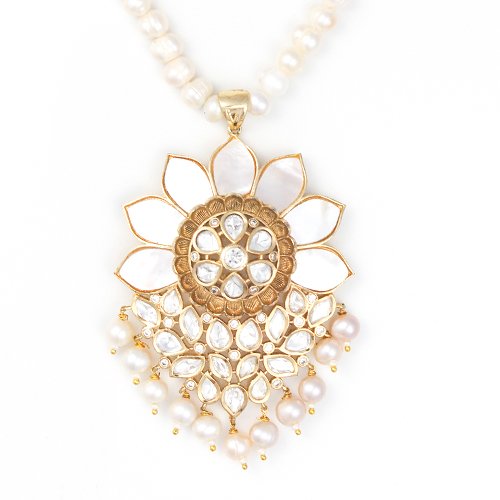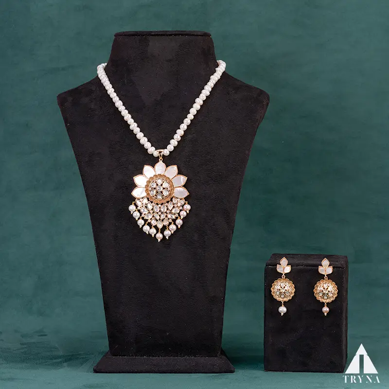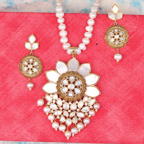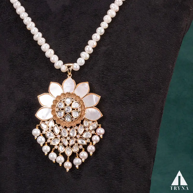 Feel and Look: This necklace showcases a stunning floral blossom pendant strung on radiant pearls. With its pearl droplets and shimmering stone embellishments, it creates a majestic and sophisticated look.