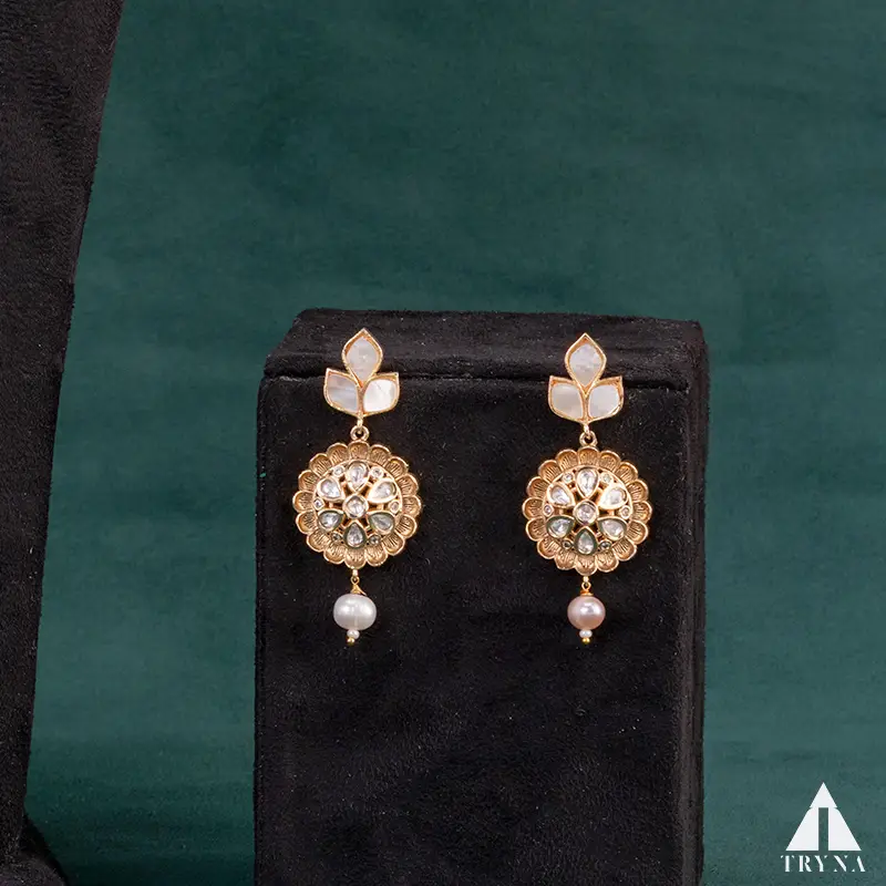 Type and Style: Gold-polished pearl necklace with a floral motif pendant, detailed with kundan-style stones and dangling pearls. A statement heritage piece crafted for traditional elegance