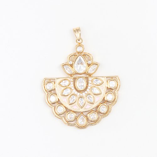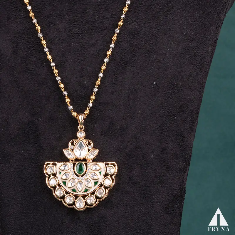 Feel and Look: This necklace features a crescent-shaped pendant adorned with kundan-style stones, highlighted by teardrop motifs and a glossy gold finish. It exudes a regal and heritage-inspired aura.