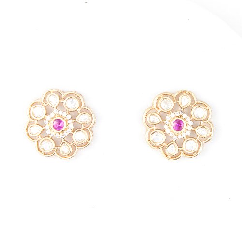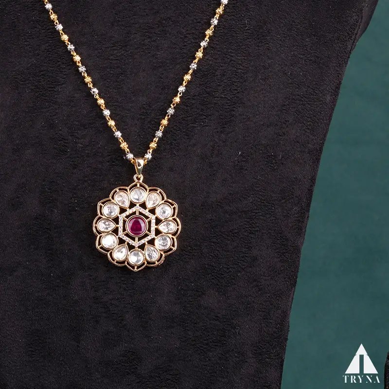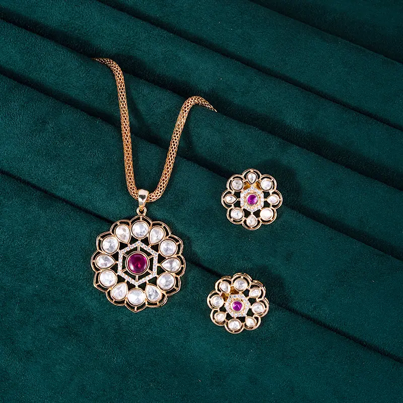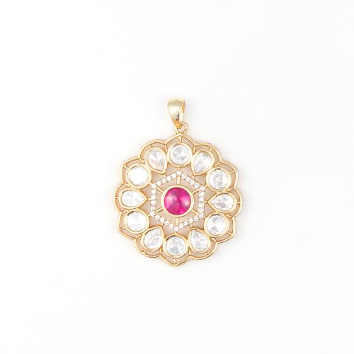 Type and Style: Gold-finish ruby floral pendant with matching stud earrings, crafted in a heritage-inspired circular pattern. A timeless design that blends tradition with luxury.