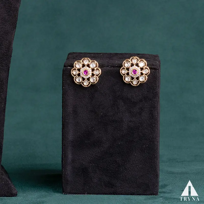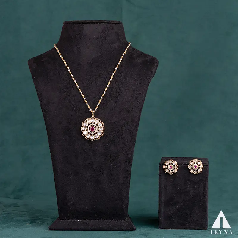 Feel and Look: Featuring a floral-inspired design, the pendant is adorned with a radiant ruby center framed by dazzling white stones. The matching earrings mirror the elegance, giving the wearer a graceful and charming presence.