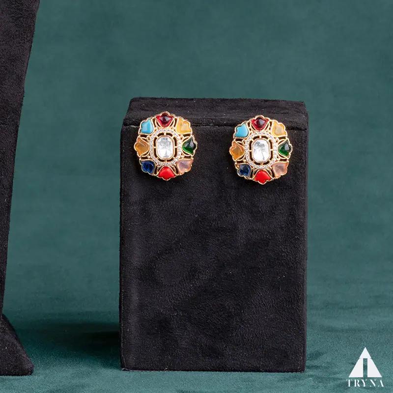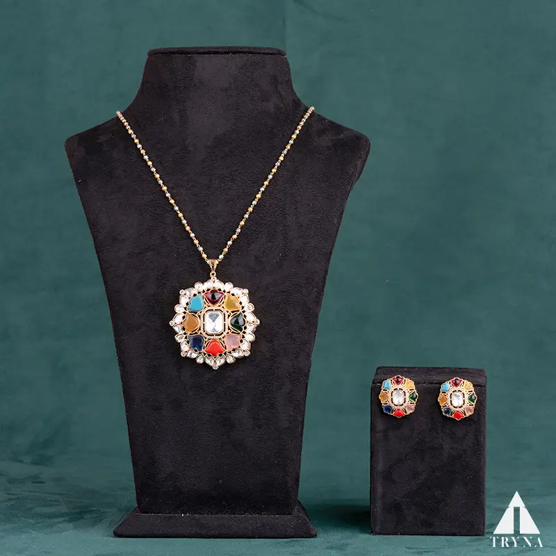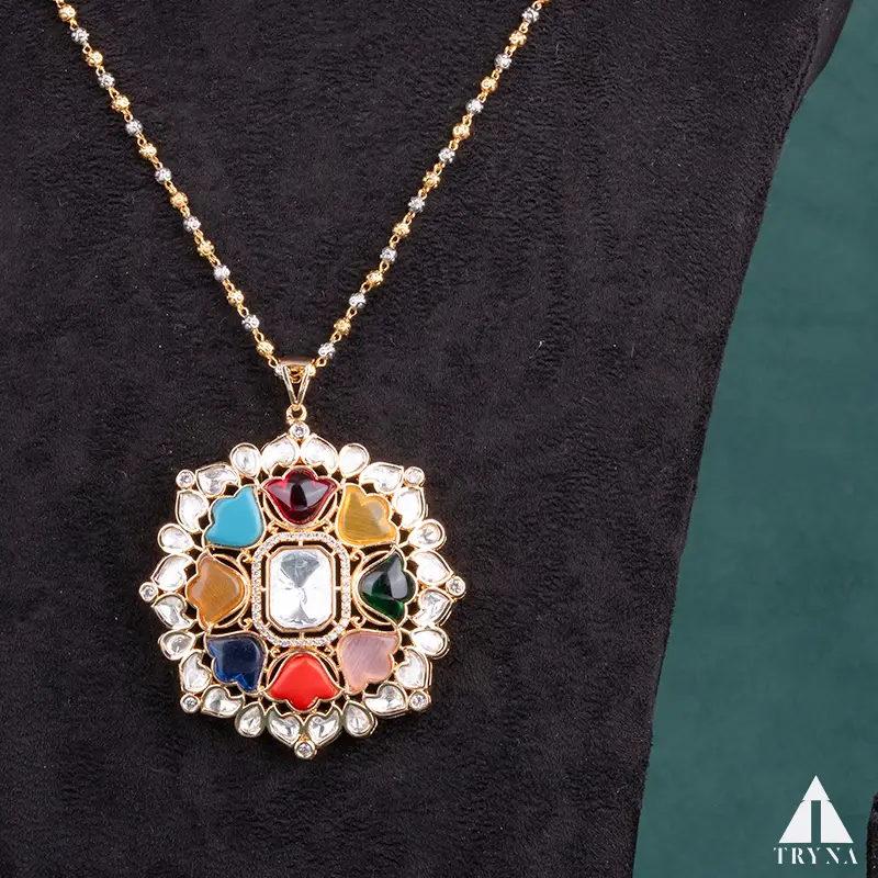 Feel and Look: This octagonal navratan pendant is beautifully set with vibrant gemstones, encircled by kundan detailing and pearls, giving it a royal, heirloom-like appeal. It blends bold colors with timeless artistry for an opulent statement.
