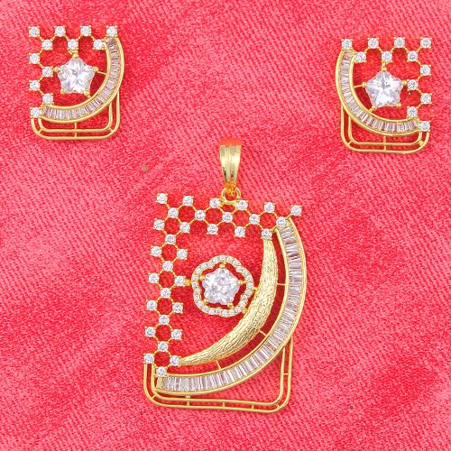 Feel and Look: This pendant set showcases a modern crescent design paired with dazzling American diamonds and a central solitaire-inspired stone. The geometric detailing gives it a regal yet contemporary appeal, while the matching earrings complete the bold look.