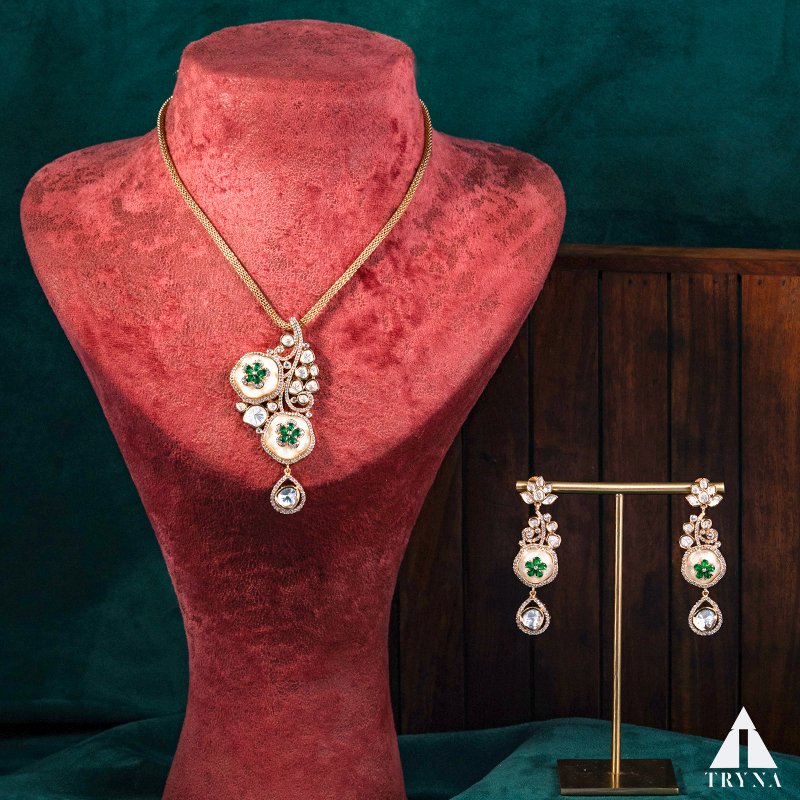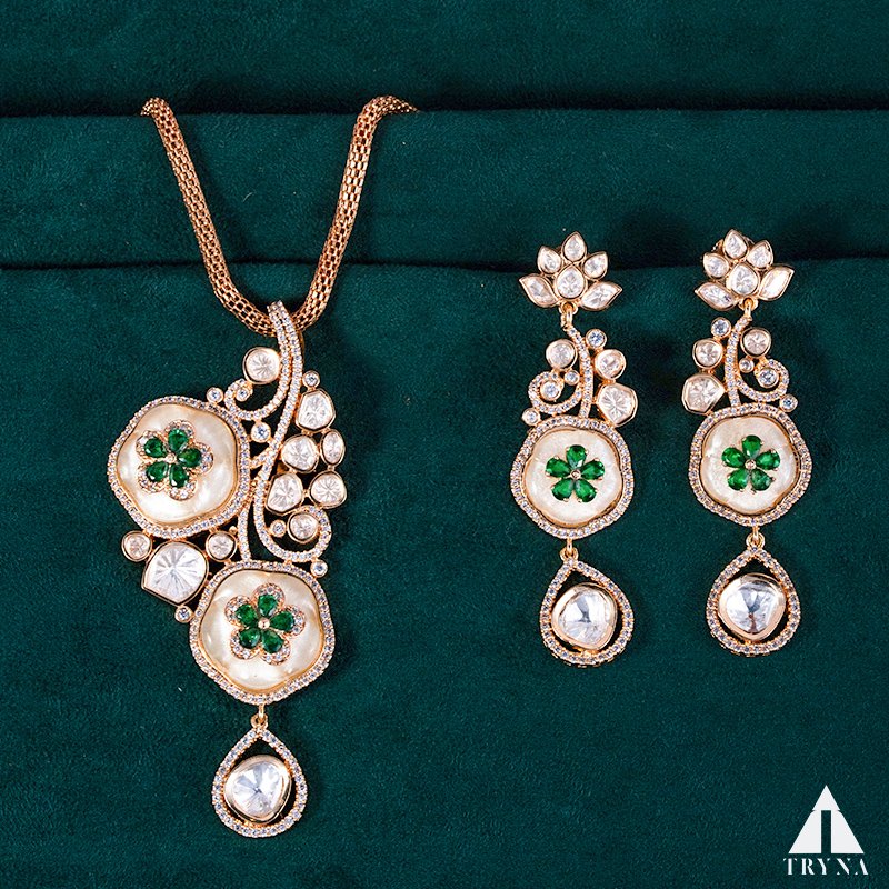 Type and Style: Gold-finish designer pendant set with floral emerald motifs, CZ stone highlights, and matching long earrings. A blend of tradition and sophistication.