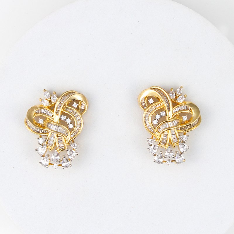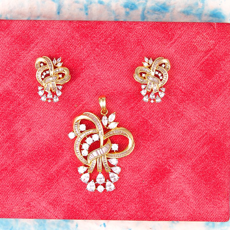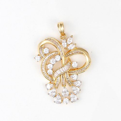 Gold-plated designer pendant with swirling knot motif, baguette lines, and round cubic zirconia drops; classic-meets-modern aesthetic.