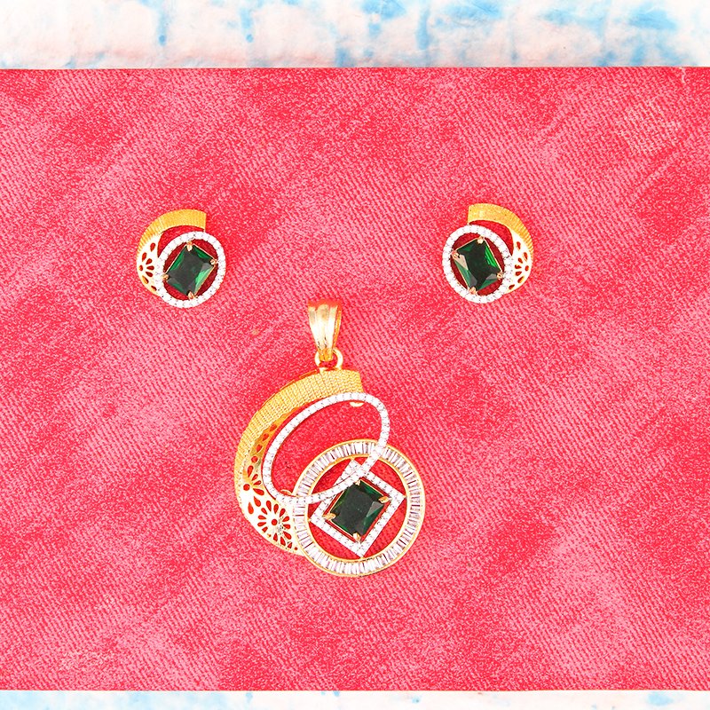 Sophisticated and luminous, this pendant highlights a vivid emerald-green centre stone framed by concentric CZ halos. The layered gold textures create depth and movement, offering a rich European luxury appeal with a striking focal glow.