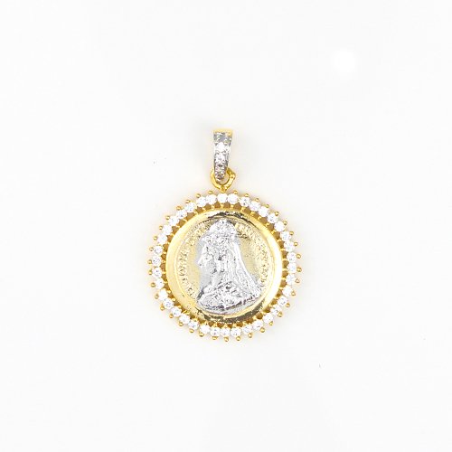Graceful and radiant, this medallion showcases a finely detailed central motif framed by a luminous halo of CZ stones. The circular form symbolises eternity, while the gold finish and soft sparkle evoke classic Russian royalty and divine elegance.