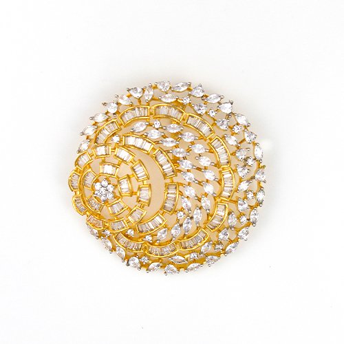 Russian-inspired designer pendant featuring a circular spiral motif with intricate CZ detailing, finished in glowing gold tones. A statement piece that blends classic grandeur with contemporary sophistication.