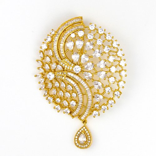 Opulent and majestic, this pendant features a graceful fusion of curved gold bands and an airy CZ mesh pattern. The clustered stones at the center create a blooming effect, while the delicate teardrop CZ drop adds fluid movement and refined sparkle. The design feels rich yet balanced, radiating elegance with every glance.