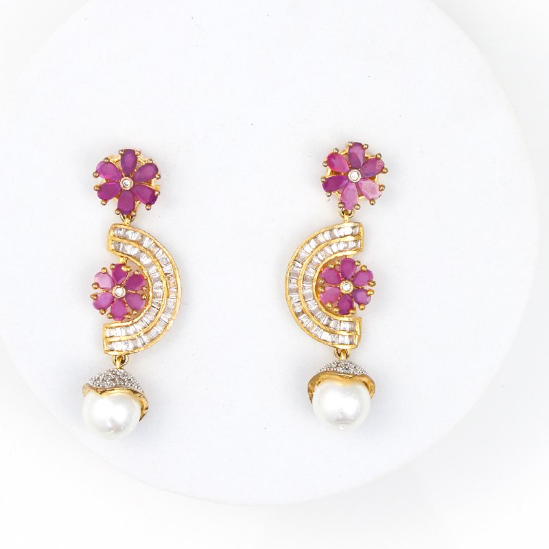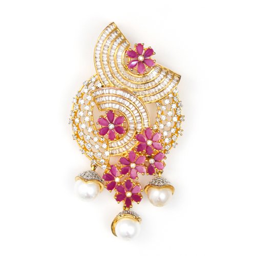 Luxurious and feminine, this pendant blends concentric gold arcs with shimmering CZ stones, highlighted by vivid floral motifs in rich ruby tones. Soft pearl drops add graceful movement and a touch of classic charm. The interplay of sparkle, color, and pearls creates a regal presence that feels opulent yet elegant.