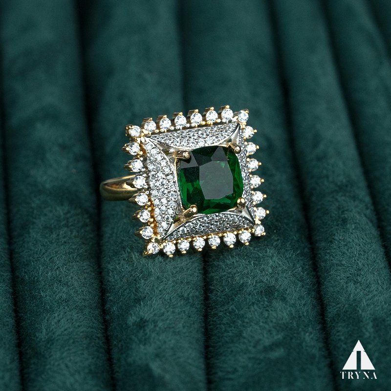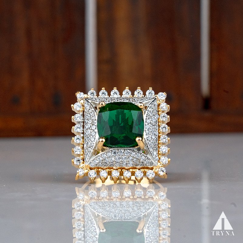 Bold and luxurious, the ring features a deep emerald, green square-cut stone surrounded by a brilliant halo of CZ diamonds. Its regal design adds an aura of power and elegance, making it the ultimate statement piece for glamorous occasions.