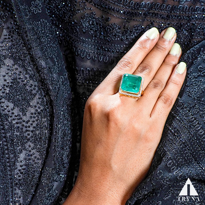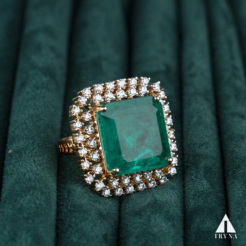 Gold-plated cocktail ring with a cushion-cut emerald green centerpiece, surrounded by two rows of brilliant American diamonds. Designed for both comfort and statement styling.