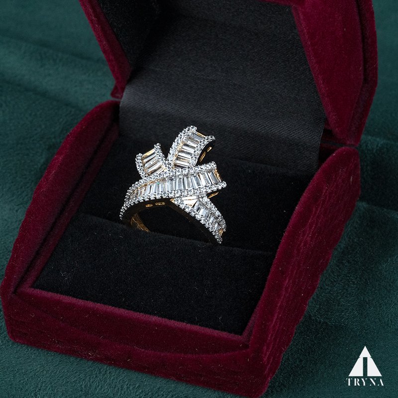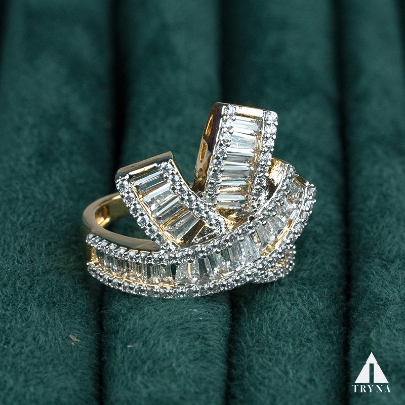 Gold-plated cocktail ring featuring baguette CZ diamonds in a crossover style, designed for women who adore elegance with a modern twist.