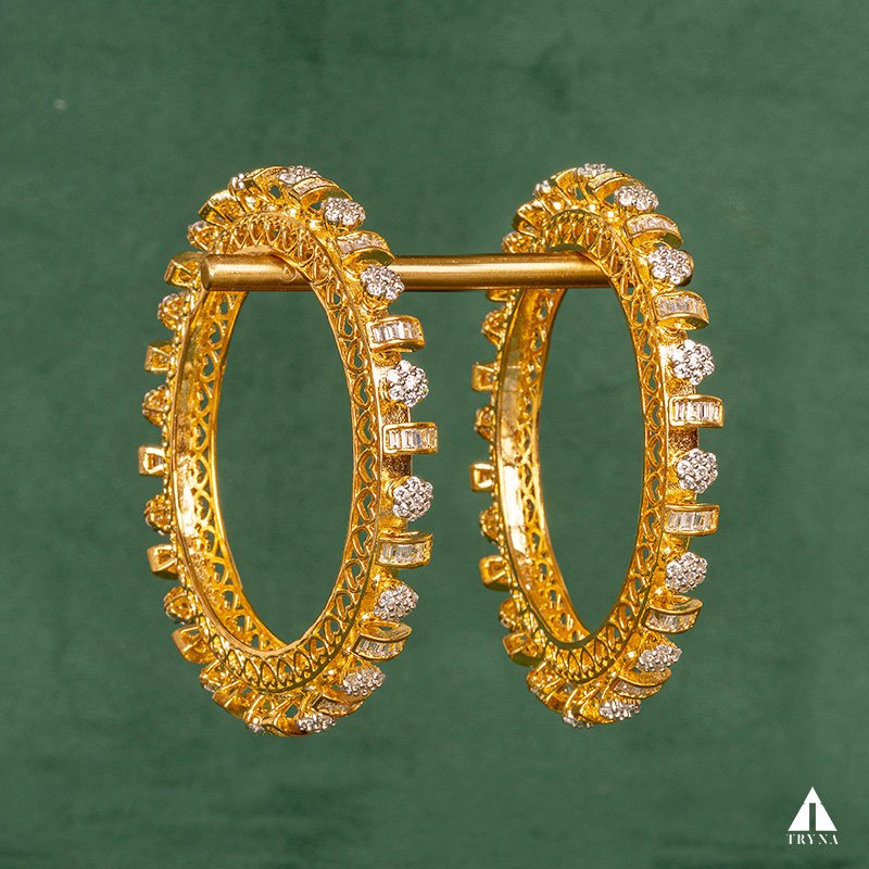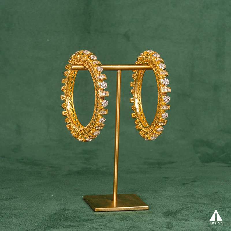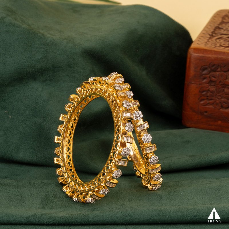 A sleek yet dazzling gold-plated bangle studded with sparkling CZ stones. It radiates sophistication and luxury, making your hands stand out beautifully during special occasions.