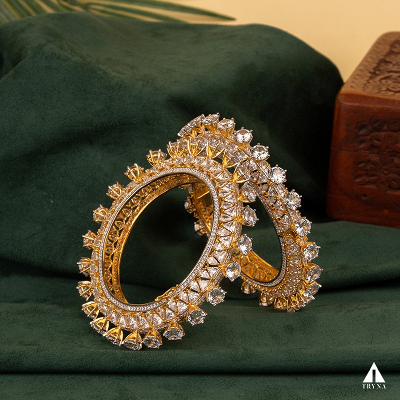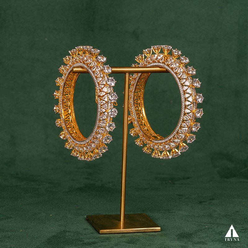 A sleek yet dazzling gold-plated bangle studded with sparkling CZ stones. It radiates sophistication and luxury, making your hands stand out beautifully during special occasions.