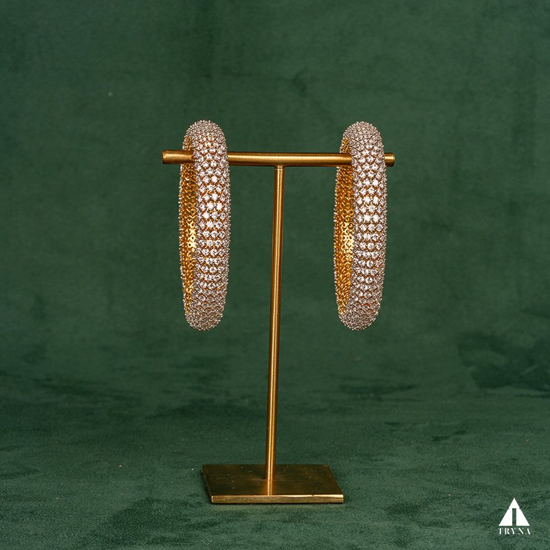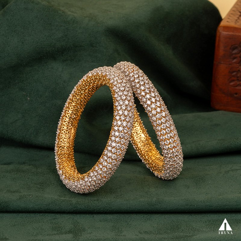 A sleek yet dazzling gold-plated bangle studded with sparkling CZ stones. It radiates sophistication and luxury, making your hands stand out beautifully during special occasions.