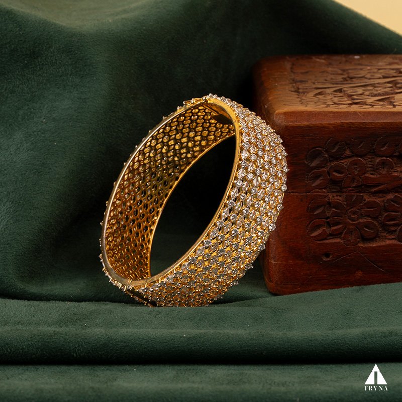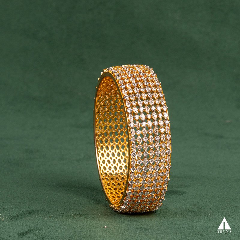 A sleek yet dazzling gold-plated bangle studded with sparkling CZ stones. It radiates sophistication and luxury, making your hands stand out beautifully during special occasions.