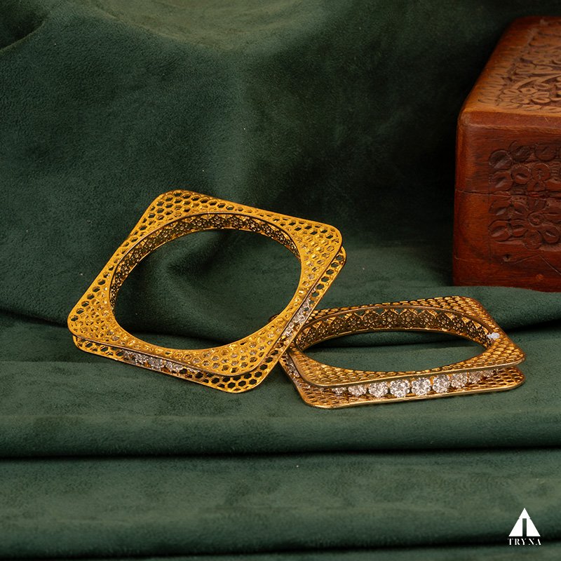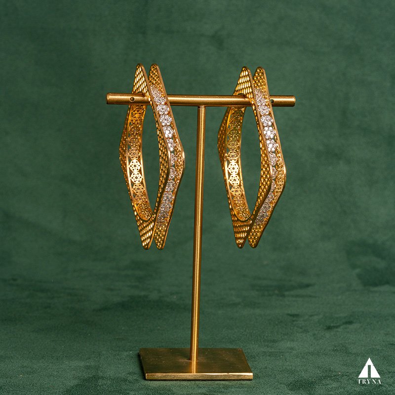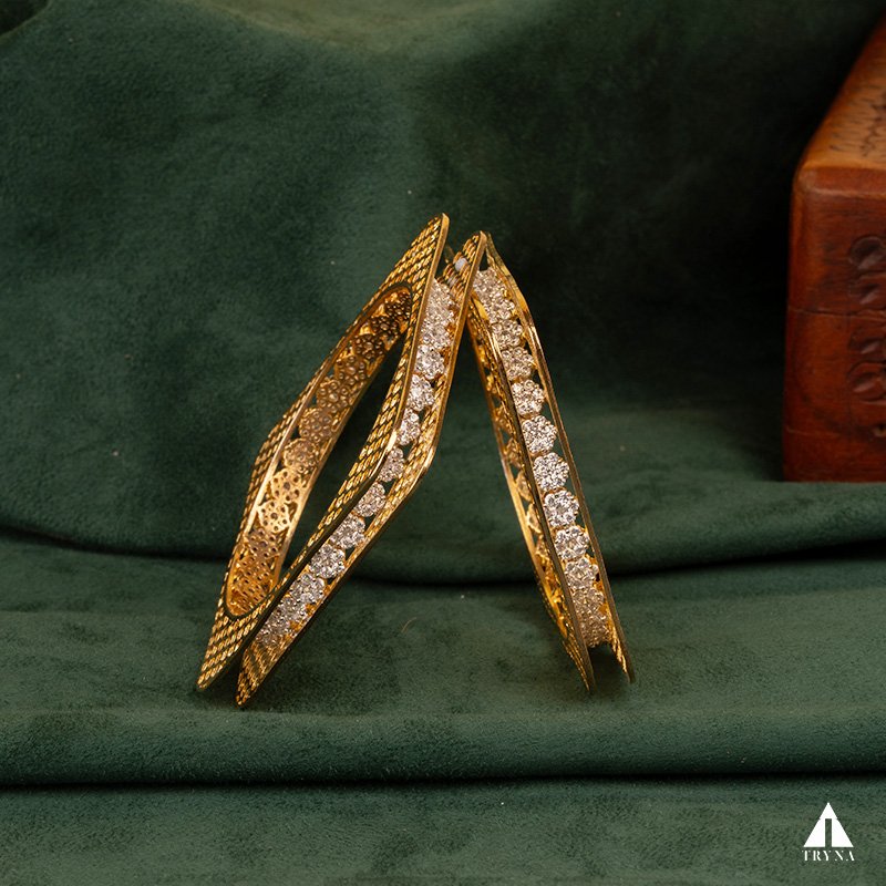 A sleek yet dazzling gold-plated bangle studded with sparkling CZ stones. It radiates sophistication and luxury, making your hands stand out beautifully during special occasions.
