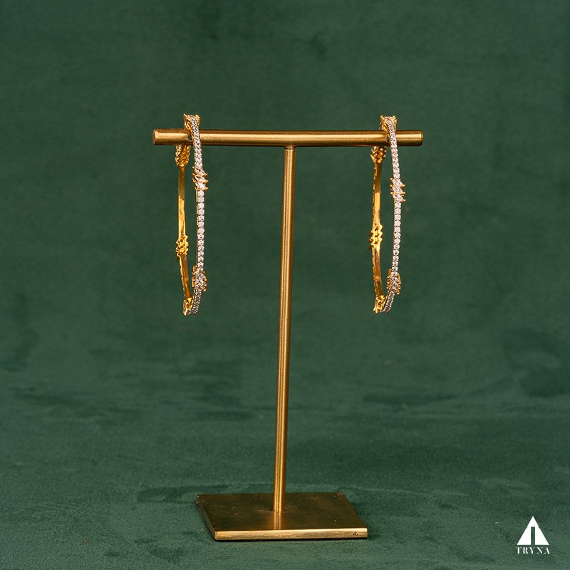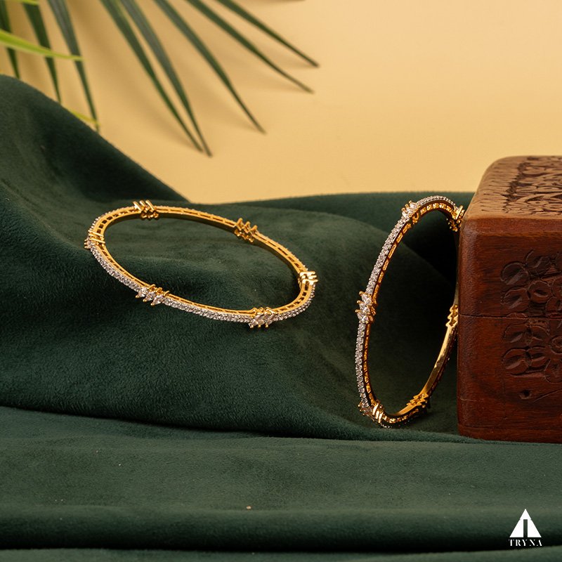 A sleek yet dazzling gold-plated bangle studded with sparkling CZ stones. It radiates sophistication and luxury, making your hands stand out beautifully during special occasions.