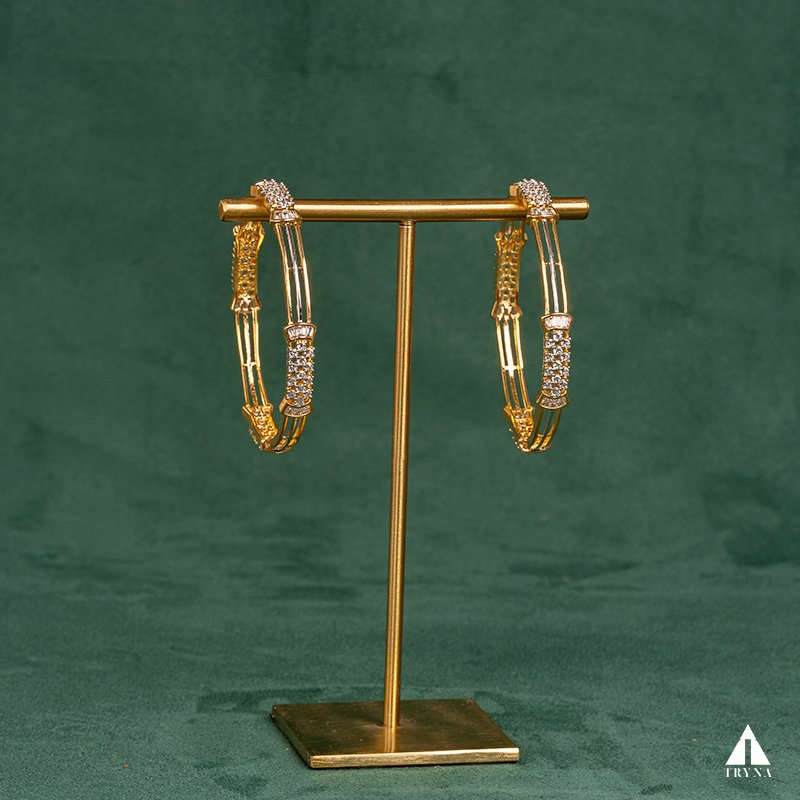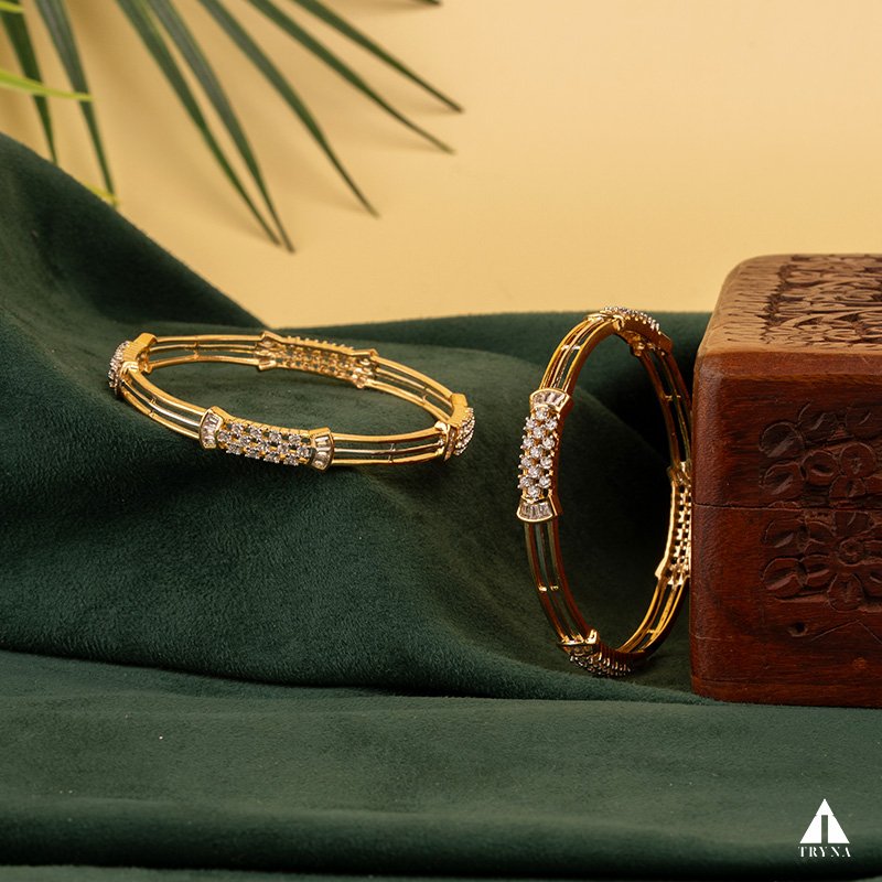 A sleek yet dazzling gold-plated bangle studded with sparkling CZ stones. It radiates sophistication and luxury, making your hands stand out beautifully during special occasions.