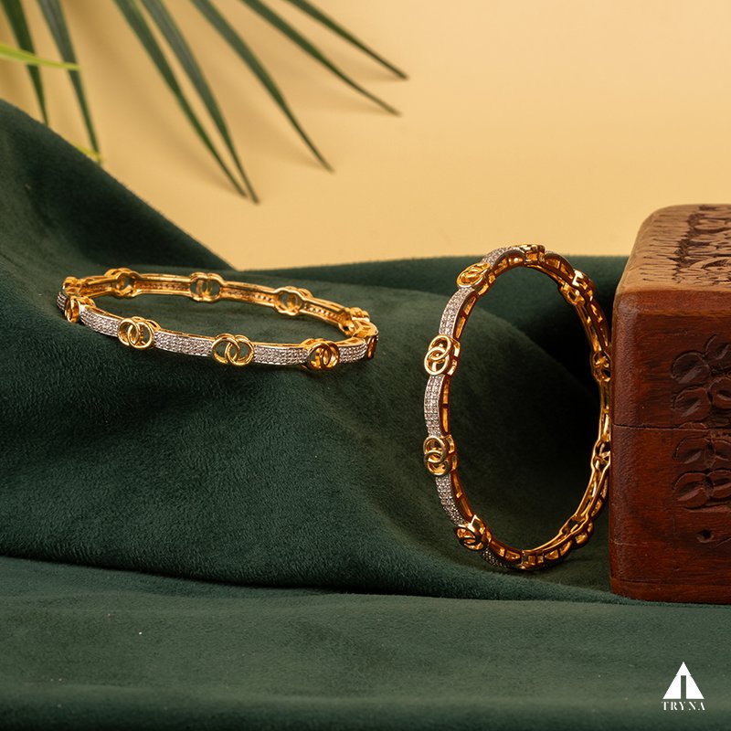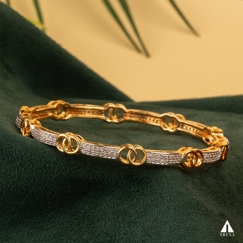 A sleek yet dazzling gold-plated bangle studded with sparkling CZ stones. It radiates sophistication and luxury, making your hands stand out beautifully during special occasions.