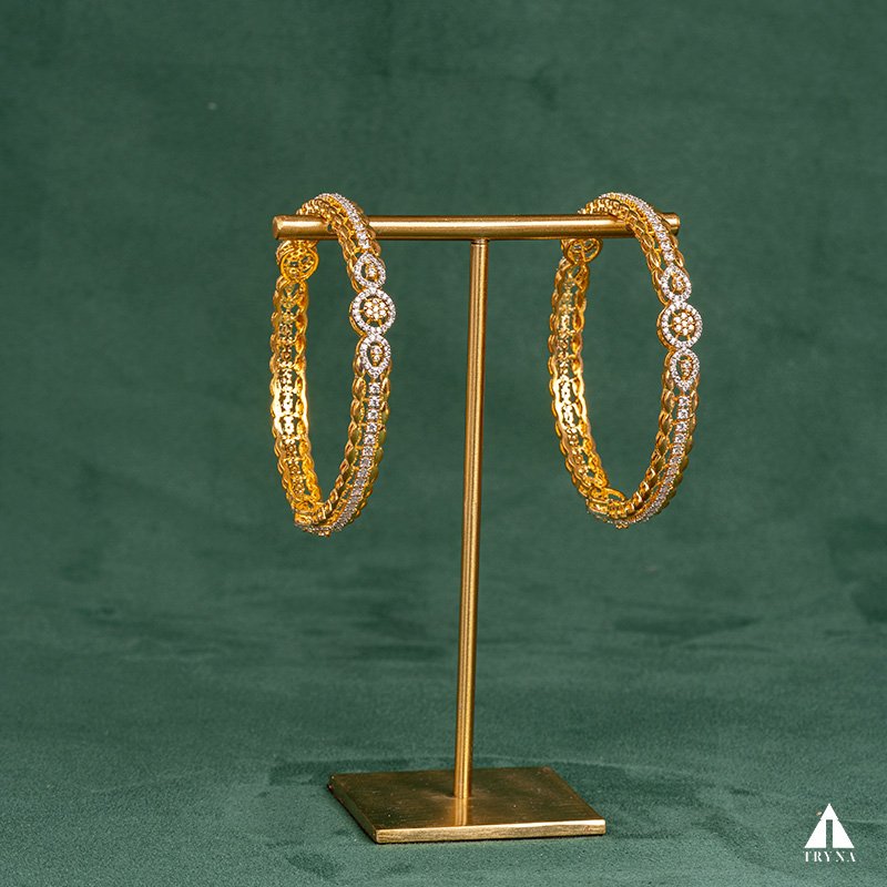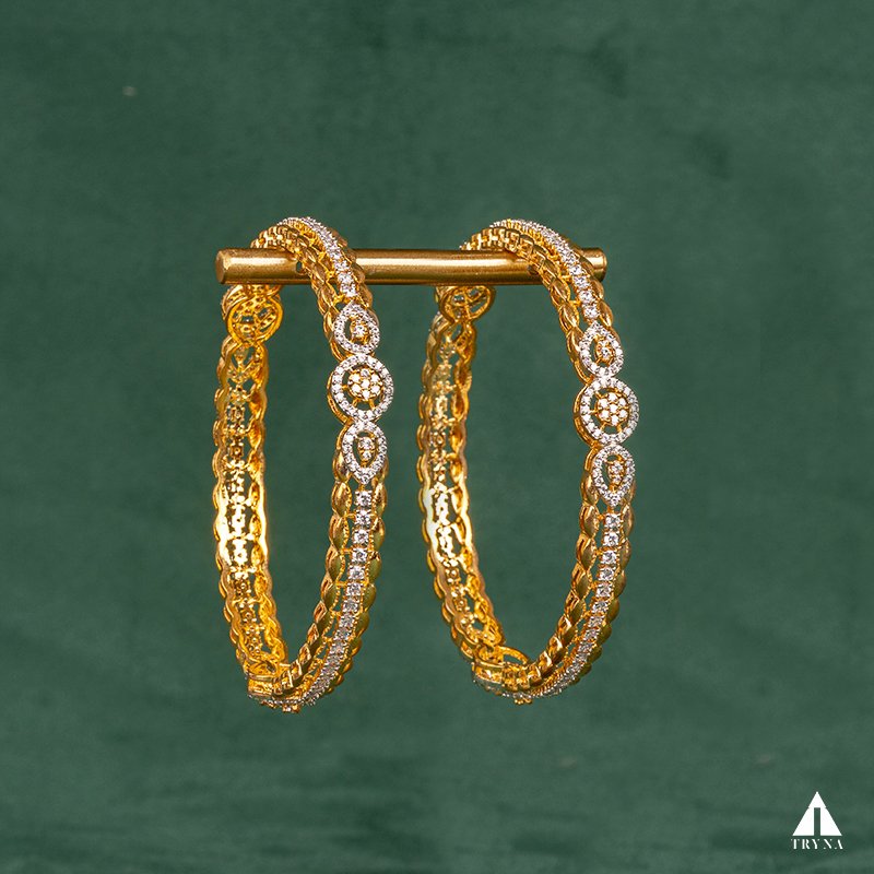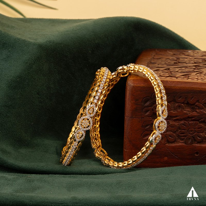 A sleek yet dazzling gold-plated bangle studded with sparkling CZ stones. It radiates sophistication and luxury, making your hands stand out beautifully during special occasions.