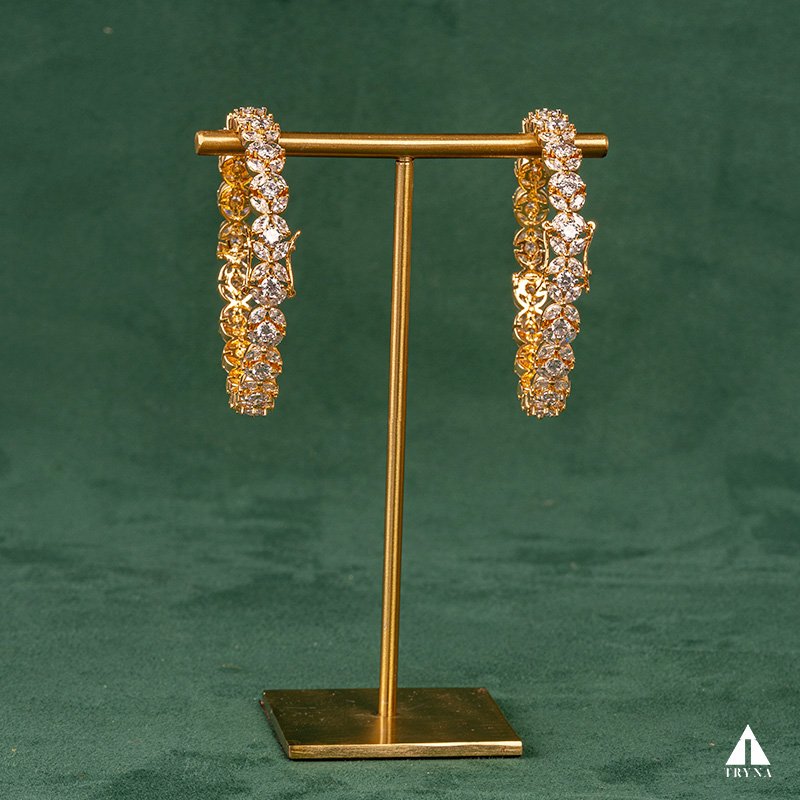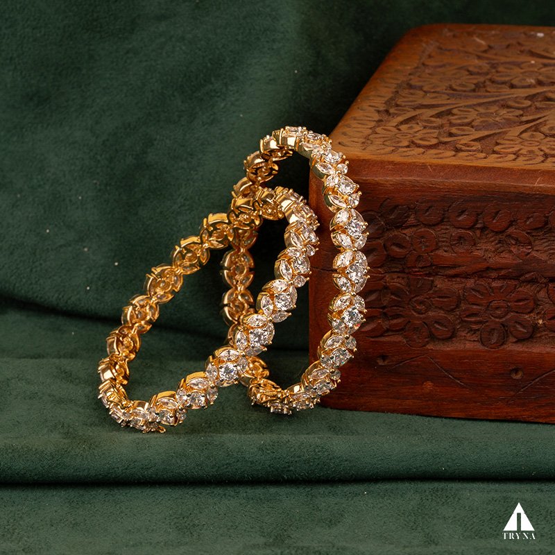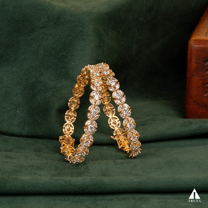 A sleek yet dazzling gold-plated bangle studded with sparkling CZ stones. It radiates sophistication and luxury, making your hands stand out beautifully during special occasions.