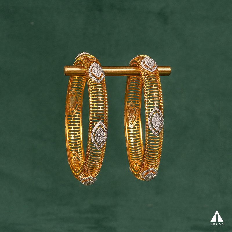 A sleek yet dazzling gold-plated bangle studded with sparkling CZ stones. It radiates sophistication and luxury, making your hands stand out beautifully during special occasions.