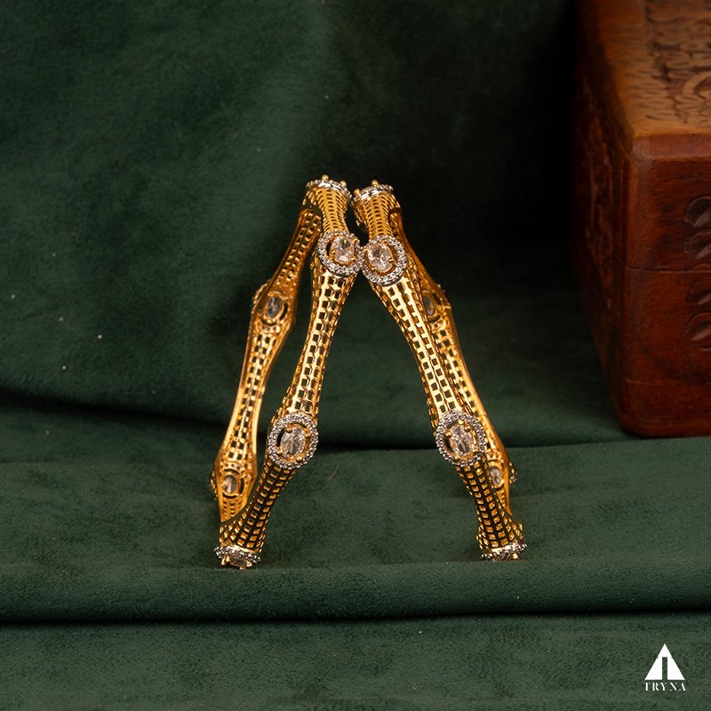 A sleek yet dazzling gold-plated bangle studded with sparkling CZ stones. It radiates sophistication and luxury, making your hands stand out beautifully during special occasions.