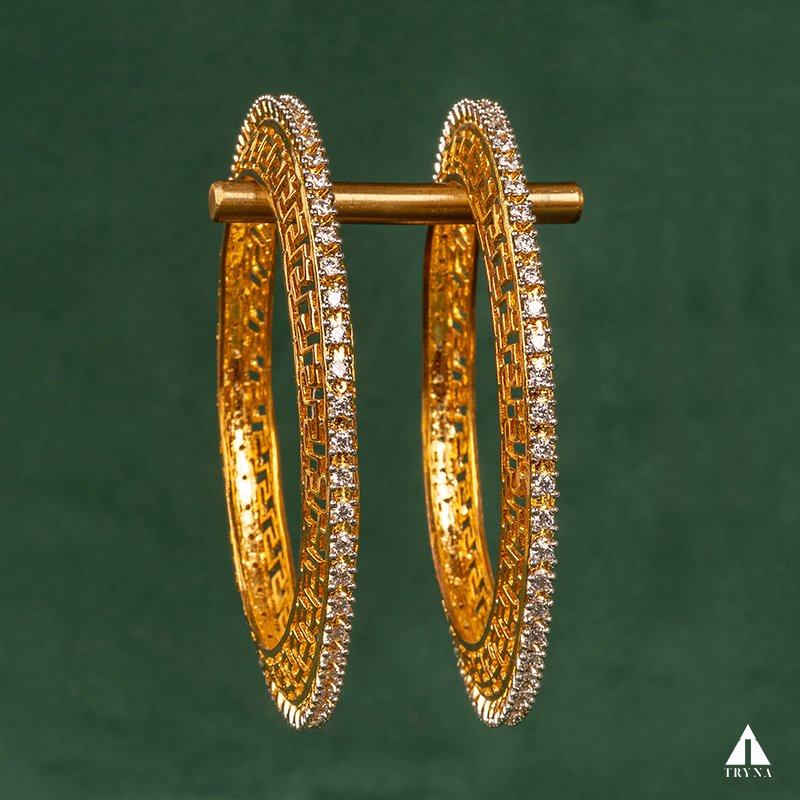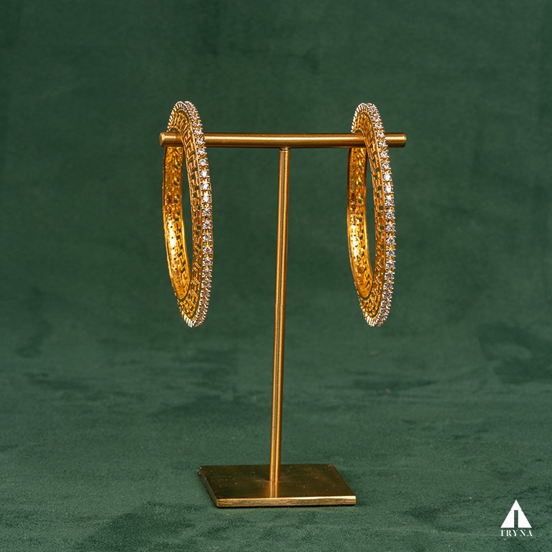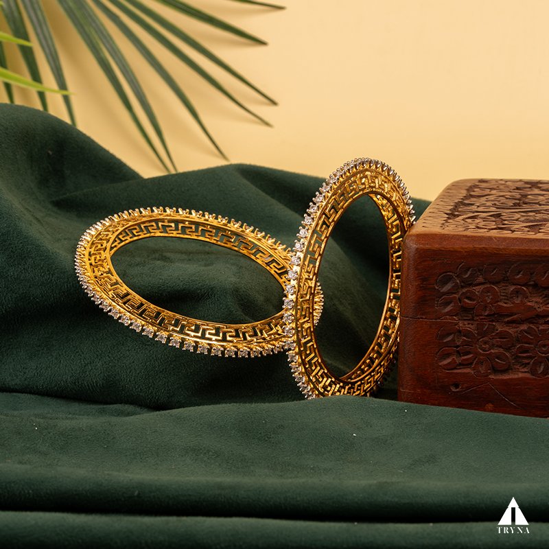 A sleek yet dazzling gold-plated bangle studded with sparkling CZ stones. It radiates sophistication and luxury, making your hands stand out beautifully during special occasions.