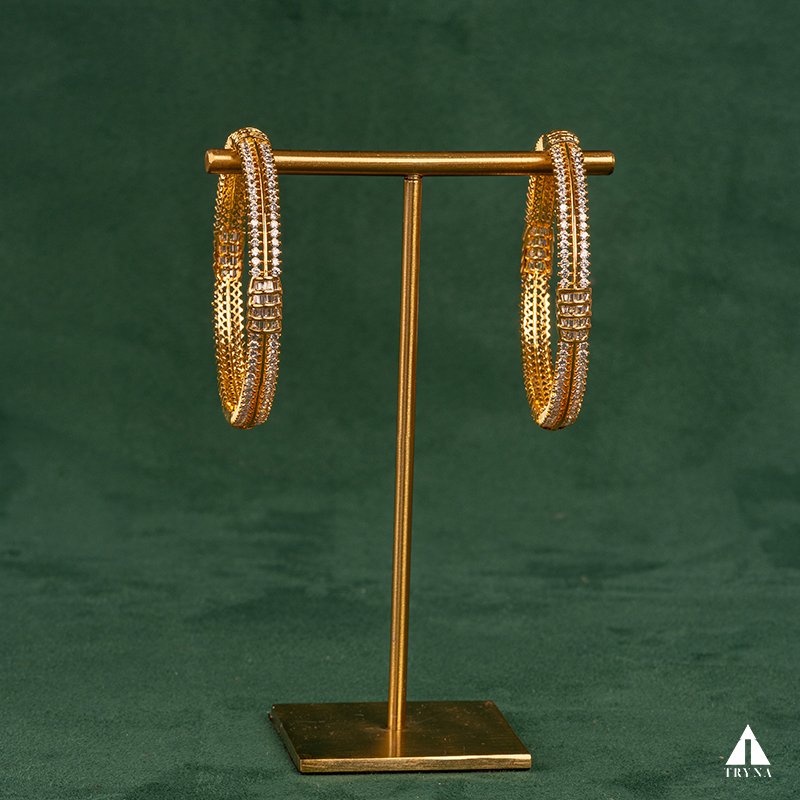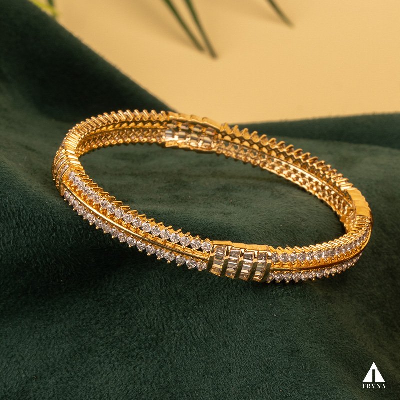 A sleek yet dazzling gold-plated bangle studded with sparkling CZ stones. It radiates sophistication and luxury, making your hands stand out beautifully during special occasions.