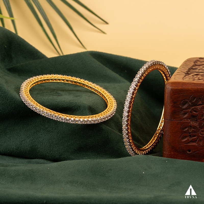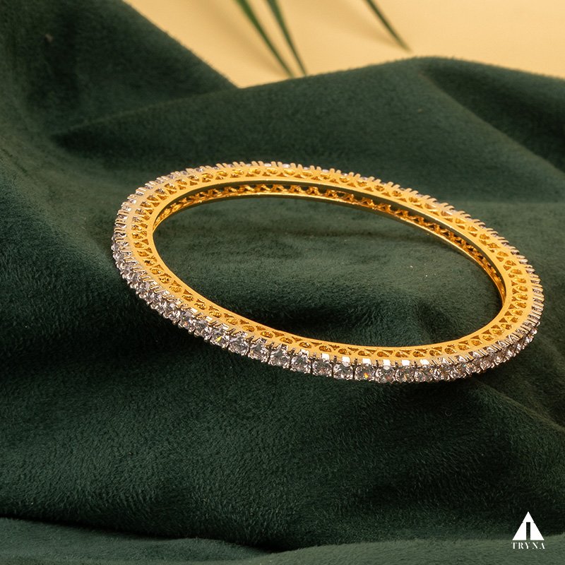 A sleek yet dazzling gold-plated bangle studded with sparkling CZ stones. It radiates sophistication and luxury, making your hands stand out beautifully during special occasions.