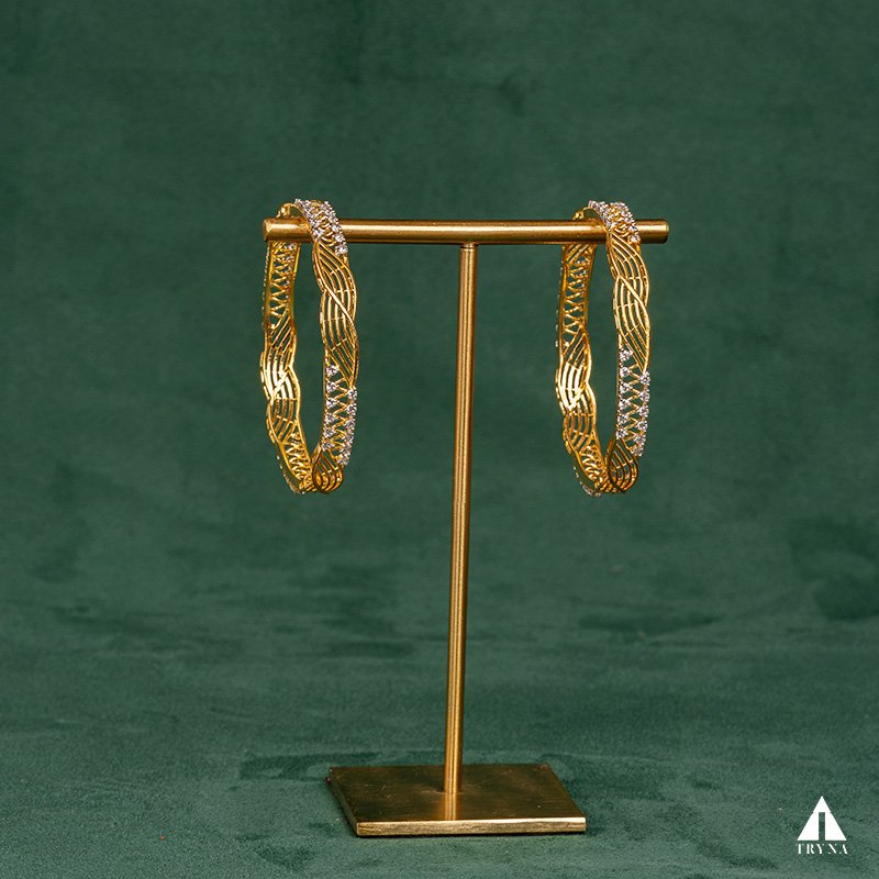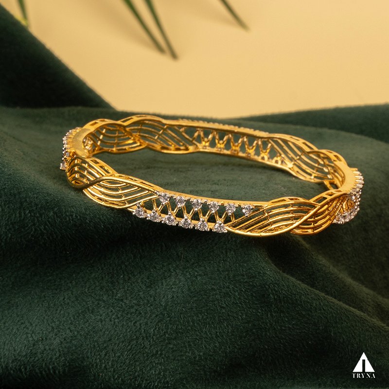 A sleek yet dazzling gold-plated bangle studded with sparkling CZ stones. It radiates sophistication and luxury, making your hands stand out beautifully during special occasions.